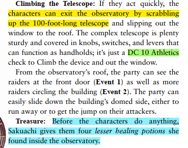 Also, there’s a bit where a druid pulls up a ladder in order to block the way forward for the PCs, forcing them to go through most of the treehouse, looking for a way up. If you want players to explore, YEET THAT LADDER INTO THE SUN. If it’s anywhere close to the edge, they might have an ability that allows them to get the ladder and skip half of the encounters. (On the flip side, if you want to compress the treehouse, leave the ladder dangling).